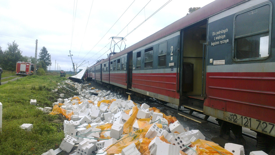Jednostka po wypadku na przejeździe kolejowym w Daszewie dn. 11.10.2016 r. Podczas jazdy jako poc. REGIO 78441 Poznań Gł. - Kołobrzeg nastąpiło zderzenie z samochodem ciężarowym. W wyniku zderzenia uszkodzeniu uległ wagon EN57-1081 ra. Fot. KP PSP Białogard (fakt.pl) |
