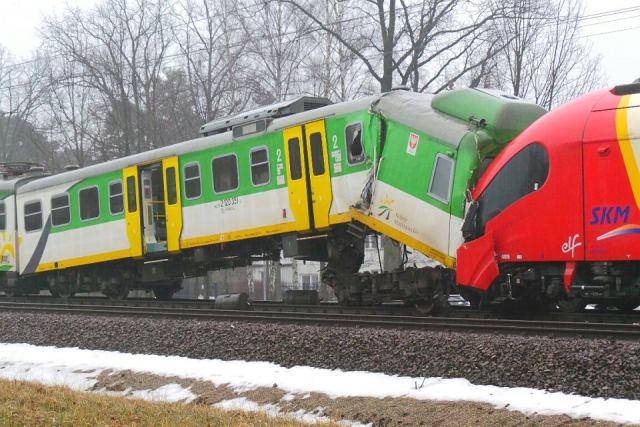 Jednostka po zderzeniu z 27WE-009 w pobliżu p.o. Warszawa Wesoła dn. 10.02.2014 r. W wyniku zderzenia zniszczeniu uległ wagon EN57AKM-1623 rb. Fot. Dariusz Borowicz (warszawa.wyborcza.pl) |